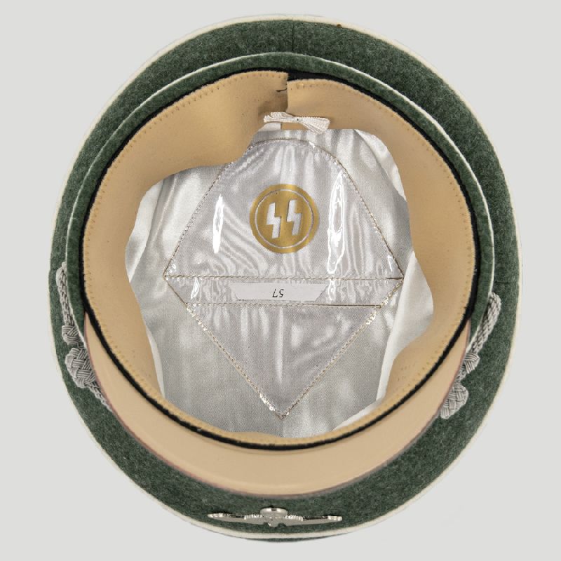 Our economy World War II Waffen SS Infantry Officers Visor Cap is an excellent reproduction of the regulation visor cap for Waffen SS Officers. In 1940, colored pipings for different branches were authorized, but this was rescinded by Himmler at the end of that same year since it was deemed too much like the Army. Other than this brief period, all officers wore white piped caps.