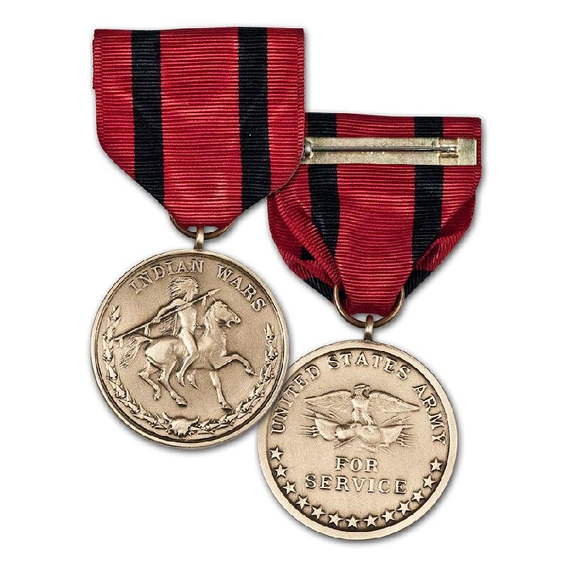 Awarded to members of the Army who served in any of the 12 different major campaigns against hostile Indians from 1865 to 1891. The obverse features a mountain Indian wearing a warbonnet and carrying a spear, plus a buffalo skull and arrowheads. The reverse shows the U.S. Eagle and the words "United States Army-For Service”.