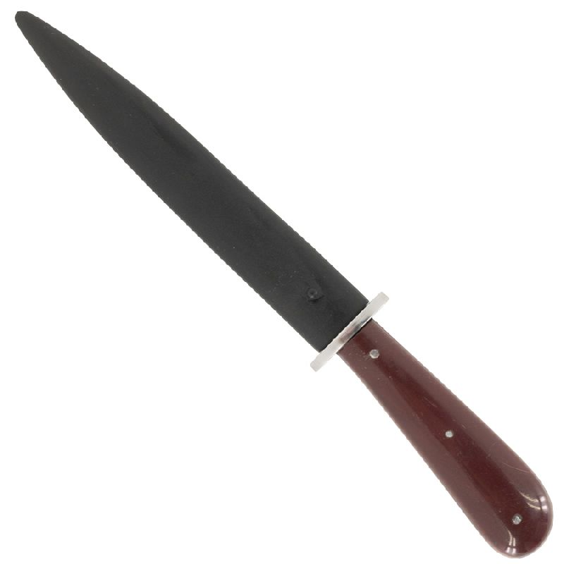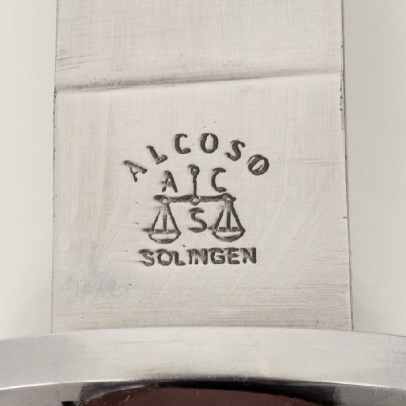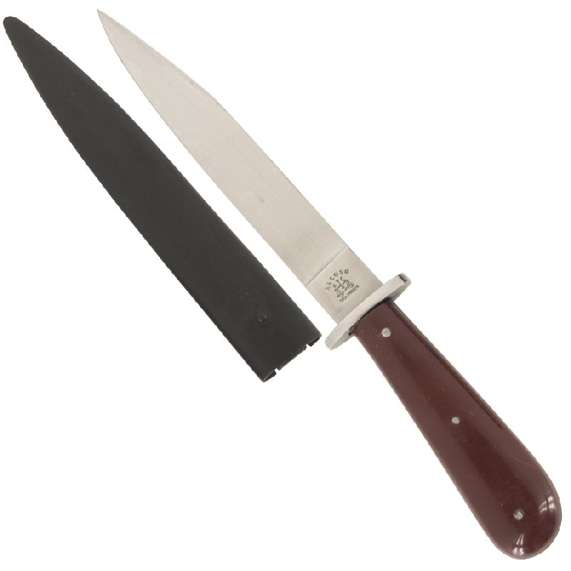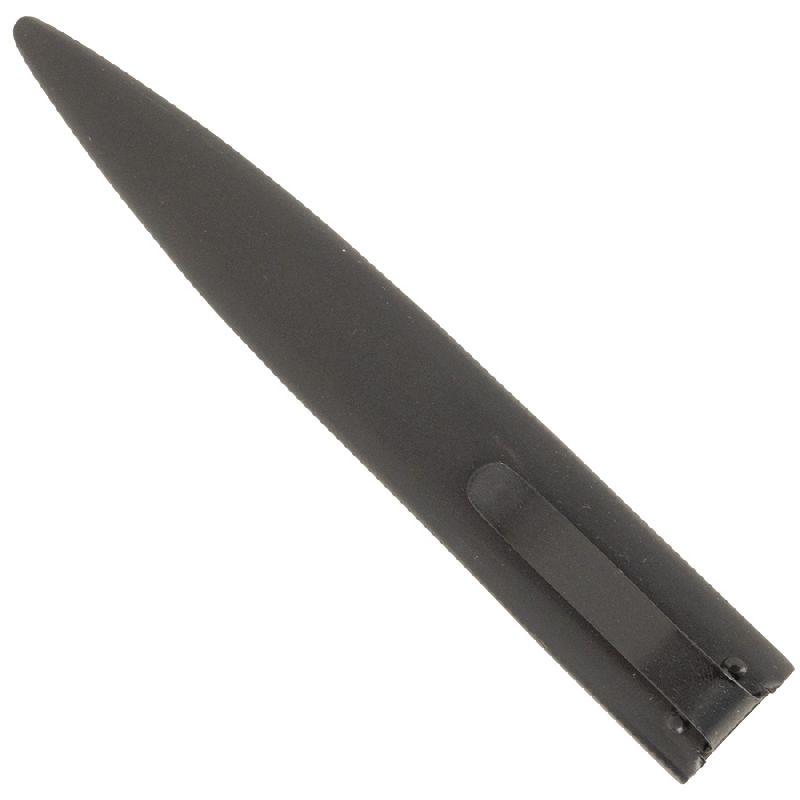 The WWII German Boot Knife was produced in large numbers and issued to German infantry troops during the war. Reddick Militaria's well-made reproduction is patterned after an original in our collection made by Puma. It features the classic drop point blade with an integral steel oval crossguard and composite grips attached with 3 steel pins. The blade is maker marked to the famous Alcoso firm, featuring there well-known “scales” proofmark. The high-quality steel scabbard is identical to the original and is finished in black enamel with a correct spring-tensioned metal retaining clip for boot or belt wear. Overall length of the knife is 10-1/2", with 6" carbon steel blade.