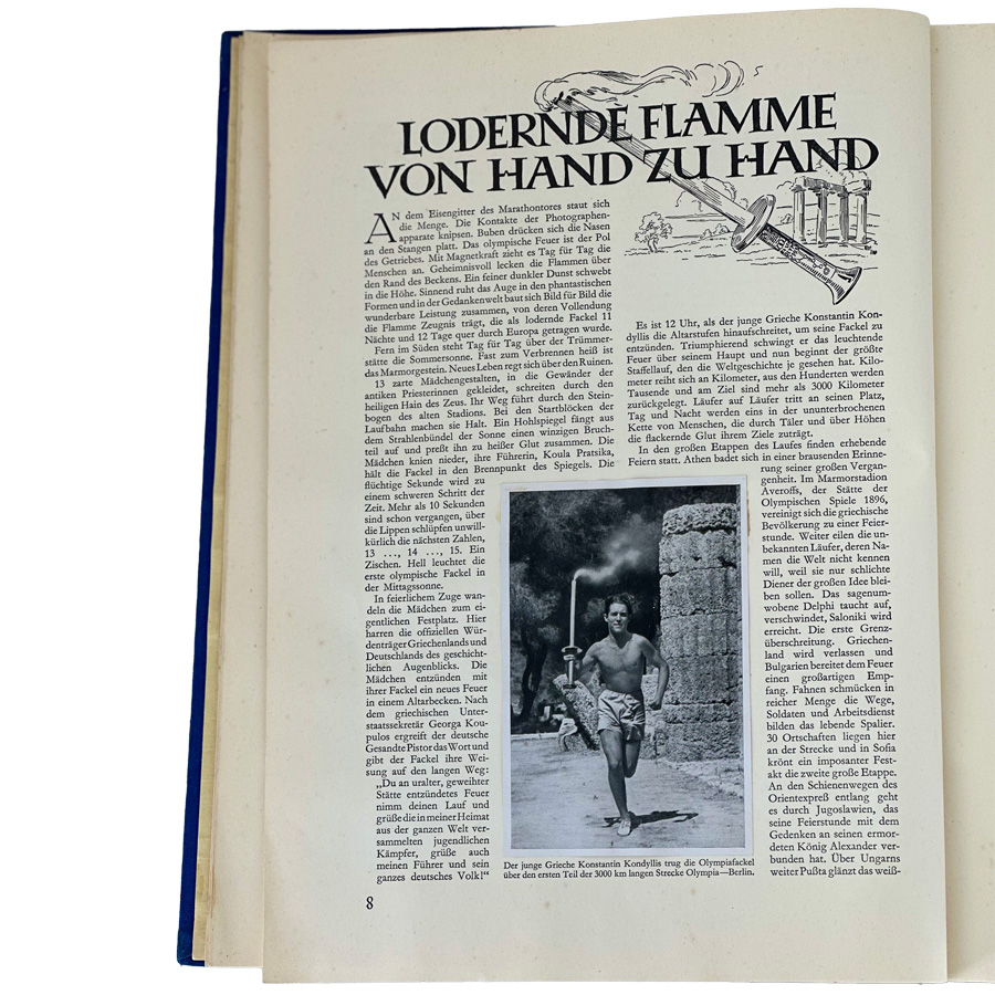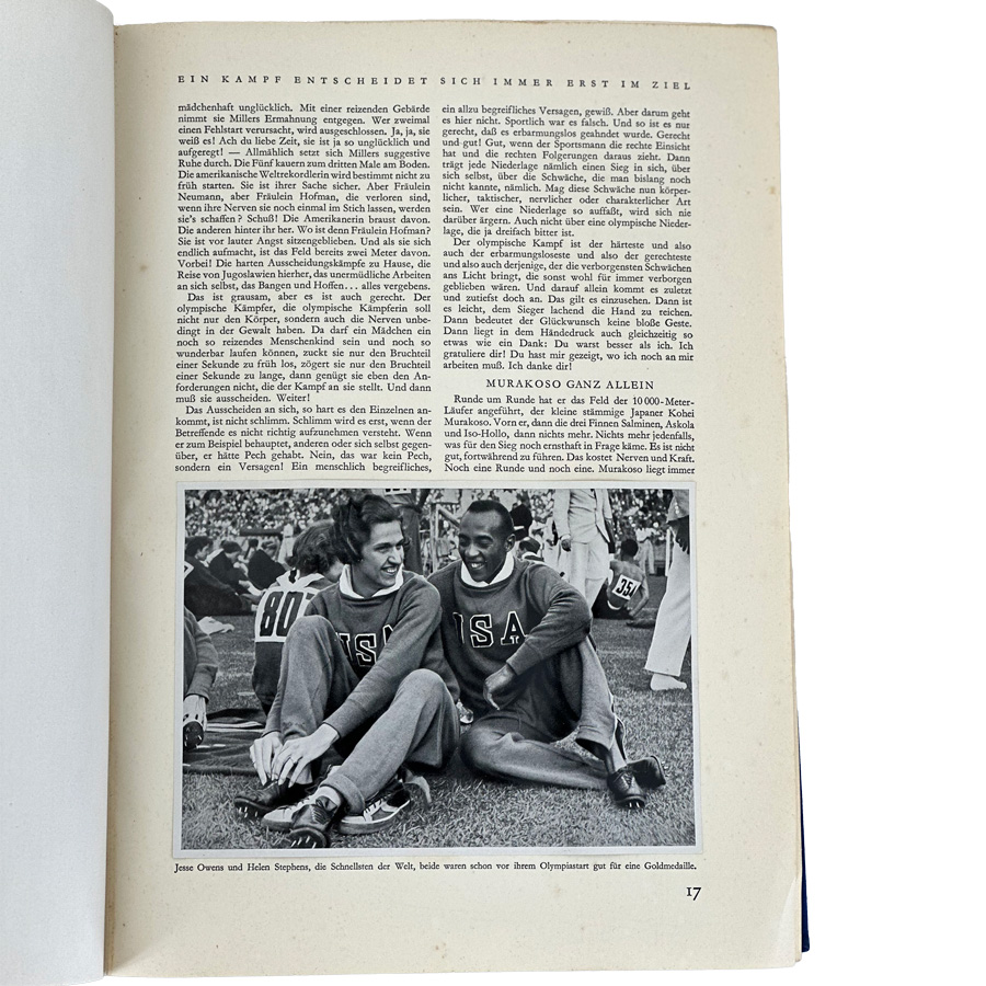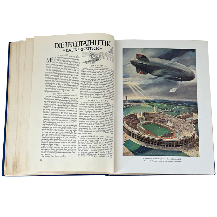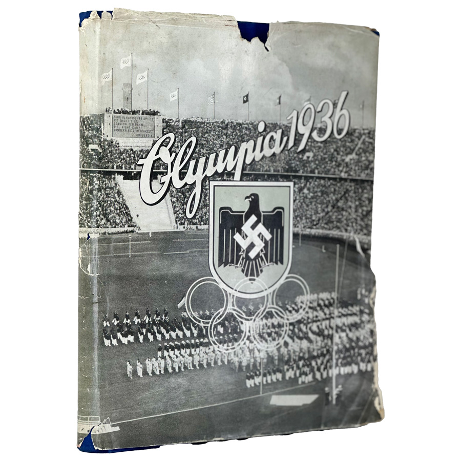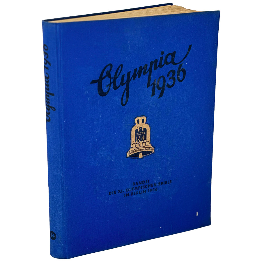 Hardbound in a dark blue cloth fabric cover embossed in gold with a gold Olympic bell and black eagle holding the five Olympic rings. The dust jacket is present, but with tears as shown in the photos. This volume covers the events of the Summer Olympics held in Berlin in August of 1936. This was the last Summer Olympics held before World War II. Excellent condition except for the dust jacket.