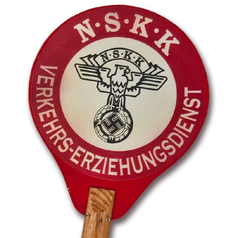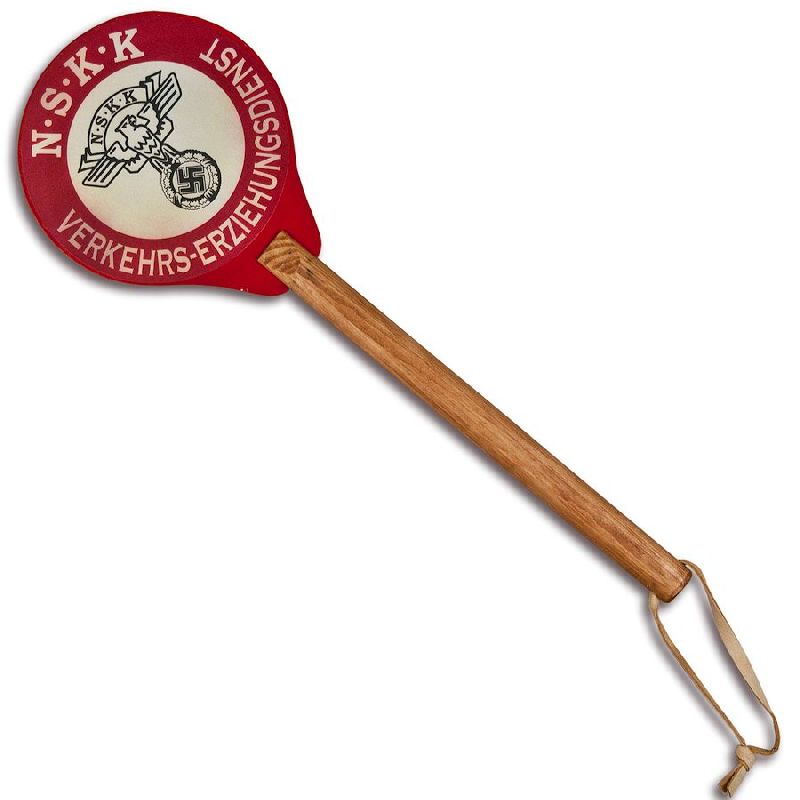 Reddick Militaria's NSKK Traffic Control Paddle are virtually indistinguishable from original Nazi examples, this rare, hand-held traffic control paddle or "stop sign" reads "NSKK Verkehrs-Erziehungsdienst", (National Socialist Motor Corps Traffic Control Service). Lightly aged and double-sided, it is mounted on a plywood disc and fitted with an original style, 15" solid wood handle with leather wrist strap, exactly like the war-time piece in our collection. Quite an interesting addition to your NSKK or Polizei collection, it makes an excellent display piece to go along with our popular "Halt Polizei" paddle. Except for the heavy dings and scratches commonly found on originals, this paddle rivals the originals in detail!
