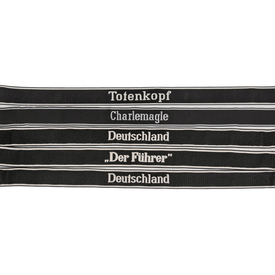 This WWII Nazi German Cuff Title Assortment is a group of 5 different styles of Bevo woven sleeve bands, including 2 Deutschland, Totenkopf, Der Fuhrer & Charlemagle. They are correctly made on old machinery and we have only one set available at this price. Huge Savings of $36.00!