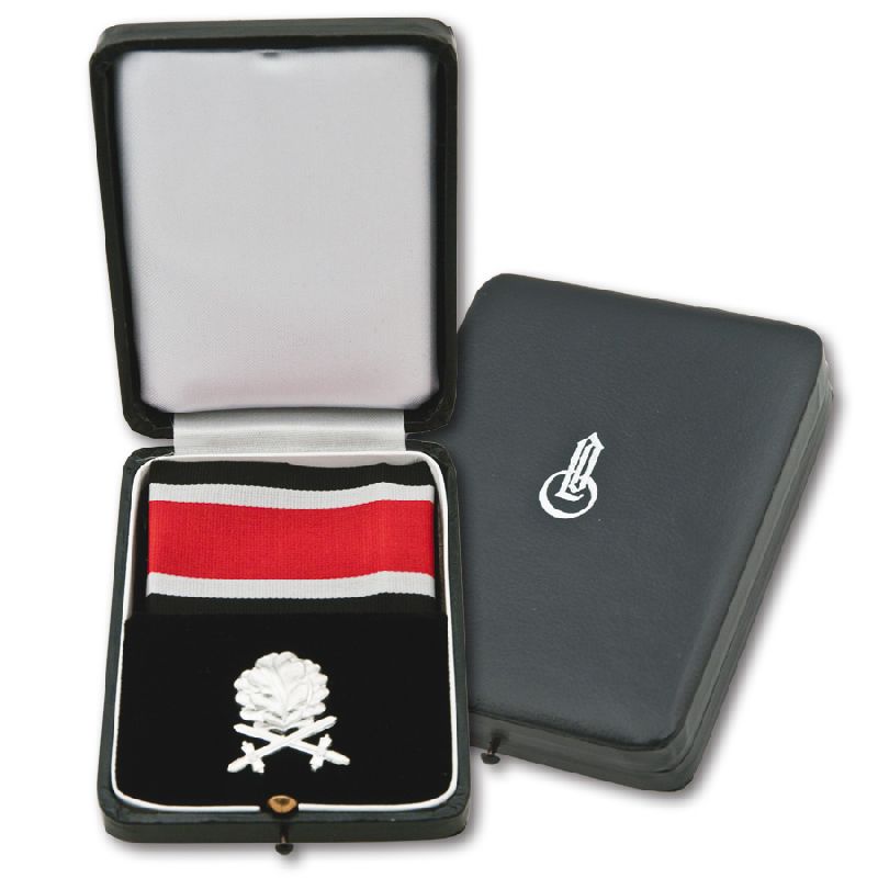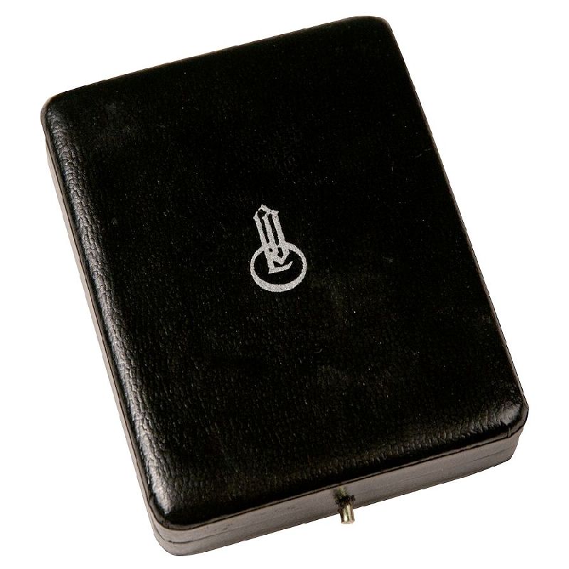 Reddick Militaria's Deluxe Presentation Case for the Oak Leaves to the Knights Cross is hight quality, covered in black leatherette with spring button closure. The interior section is fitted for both the Oak Leaves and the Knights Cross ribbon and covered in black, and features a white "collar", and white satin lined top. This case has rounded corners and is correctly embossed with silver "LDO" markings on top.