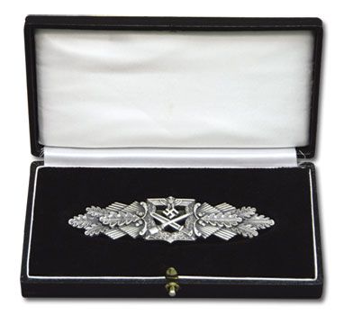 Our Deluxe Presentation Case for the German WW2 Close Combat Bar is a quality case covered in black leatherette with fitted black velvet bottom and white satin top lining, recessed for the award. Measures approximately 5-1/2" x 2-3/4".
