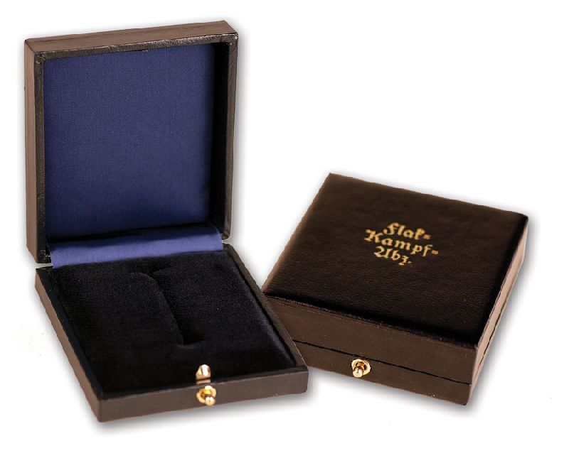 Our deluxe quality Luftwaffe Flak cases are hand crafted to wartime specs, featuring embossed tops with correct gold lettering. Covered with properly textured, dark blue linen, blue velvet bottoms, blue satin-lined tops, and correct push button closures. They will enhance any badge collection or display.