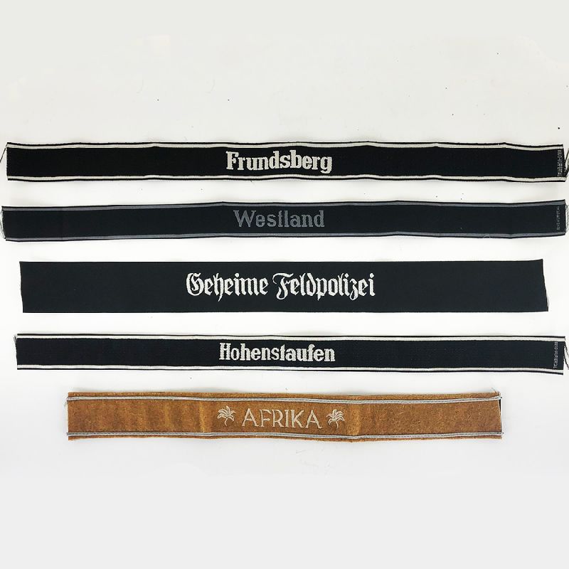 These WWII Nazi German Cuff Titles are groups of 5 assorted styles, most of which we have never offered before. They are primarily jacquard-woven like the wartime originals, with some embroidered examples. Many of these are exceedingly rare examples not generally seen for sale. Huge $31.00 Savings!