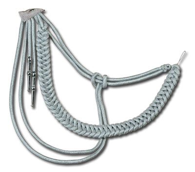Our Officer's Adjutant Cord is high quality aluminum-silver bullion and was worn over the shoulder on both parade and service tunics. This is the 1935 Pattern, known as the Adjutantenschnur or Adjutantenabzeidhen and authorized for wear by Wehrmacht officers throughout the war. It was worn by Allgemeine and Waffen SS officers up until 1938 when the new SS Pattern was introduced. Identical to the WWII models, these are complete with metal tips.