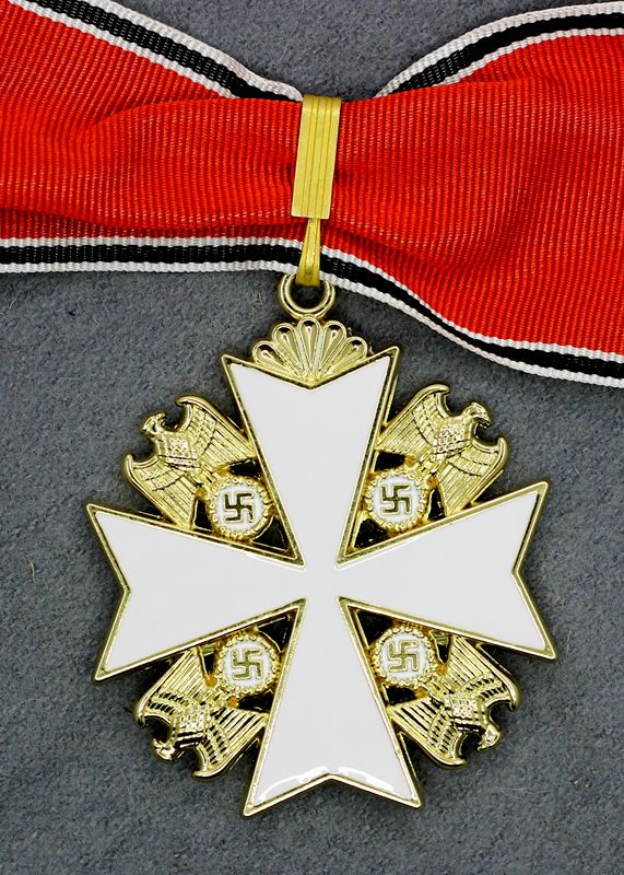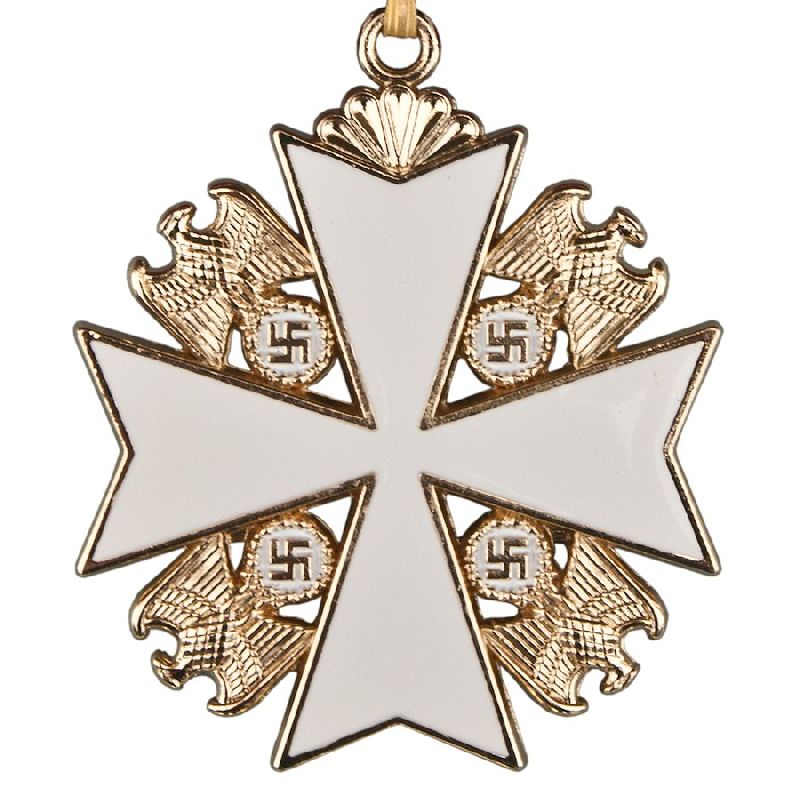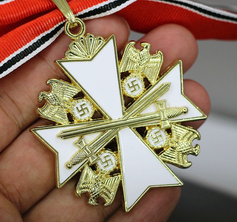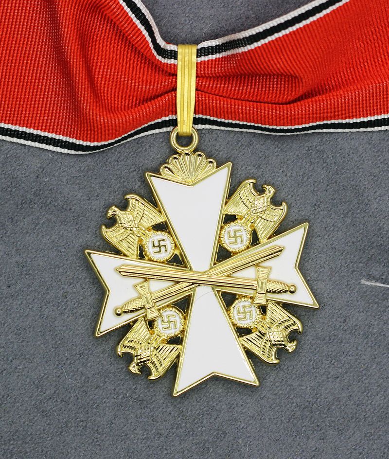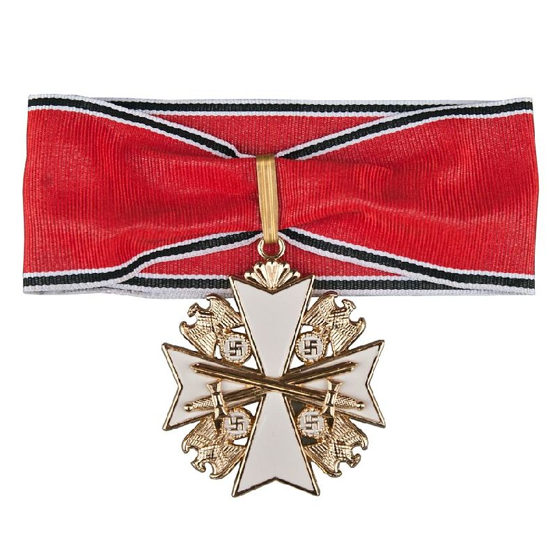 The German Eagle Order Neck Cross with Swords, 3rd Class, is one of the rarest and most impressive of the Nazi Party awards, featuring a fine gilt finish with high quality white enameling. Identical to the original, this fine quality reproduction is complete with the correct suspension loop and white, black and red neck ribbon.