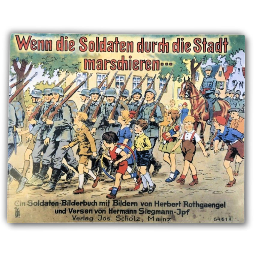 Soldaten: When Soldiers March Though Town is a German children’s classic book published in 1942 after noted illustrator Herbert Rothgängel made 14 colored drawings to accompany the Hermann Siegmann poem by the same name. It was an instant war-time hit among grade school age children who got a chance to see their troops and equipment pass in review, and to fantasize about being soldiers themselves. 16 pages with the 14 original drawings and covers reproduced in full color. 6.5” x 5.3”. SC