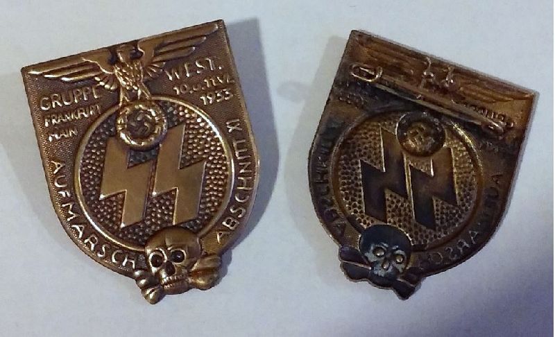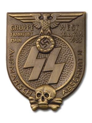 Reddick Militaria's SS Gruppe West tinnie is a die struck, hollow back commemorative badge featuring the early SS eagle and Totenkopf skull, large SS runes. The lettering read “Gruppe West, Frankfort Main, 10 u.11.VI 1933, Aufmarsch Abschnitt XI”