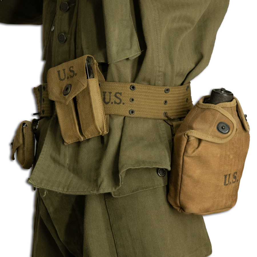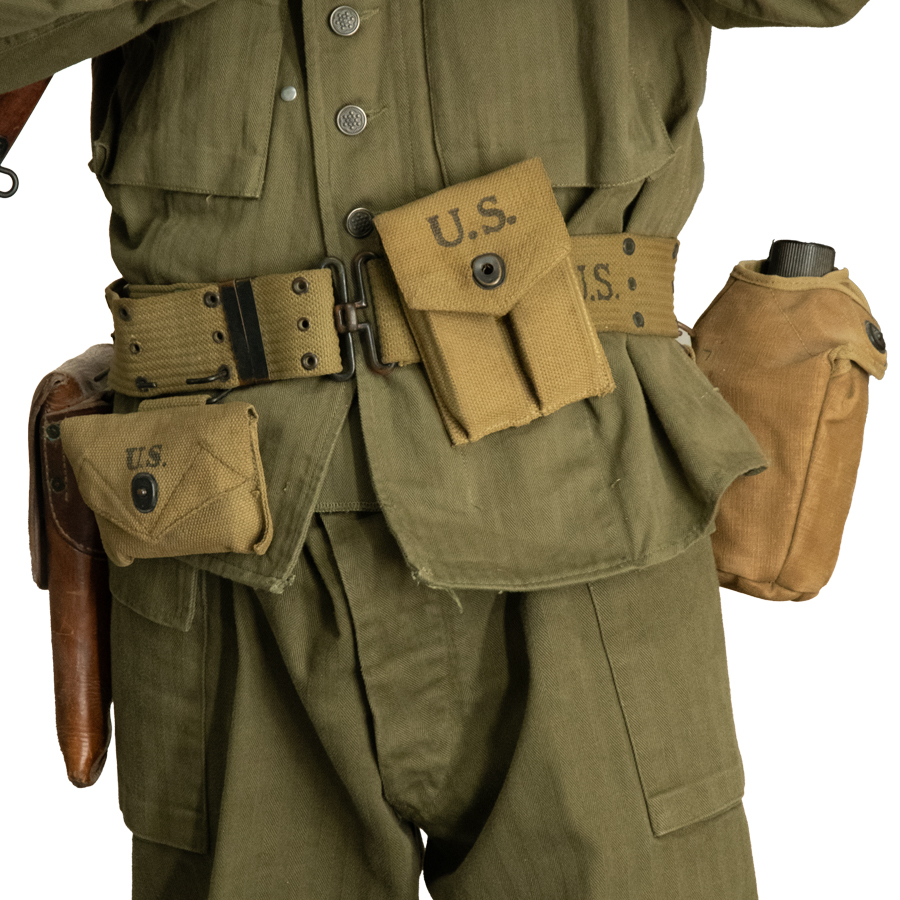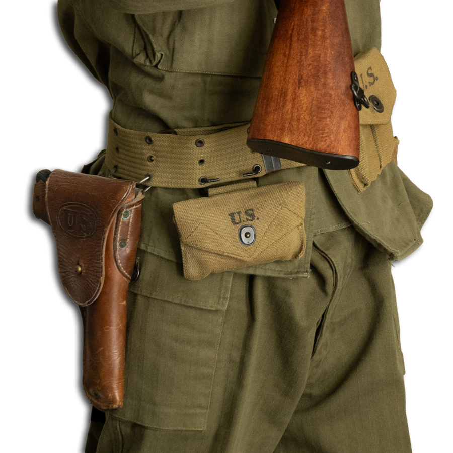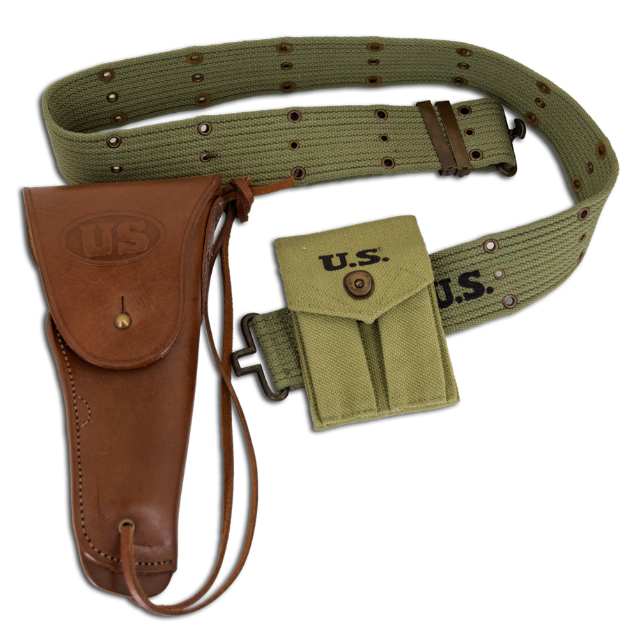 The classic U.S. WWII combat infantryman's belt and sidearm combination rig: 1936 Web Pistol Belt, 1916 Model .45 1911-A1 Holster & .45 Caliber Ammo Pouch.