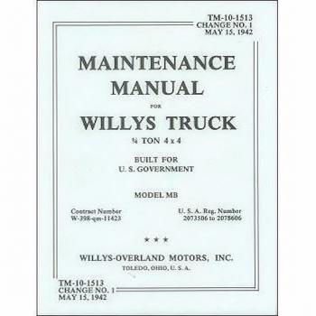 Reprint of the original manual published by Willys-Overland Motors, Inc. for the US Government in 1942.Technical Manual TM-10-1513 - the complete maintenance manual for Willys MB and Ford GPW jeeps. Many photos & line drawings, including acomplete tool list, 18 page section in Russian. 158 pgs. 8.5" x 11". SC