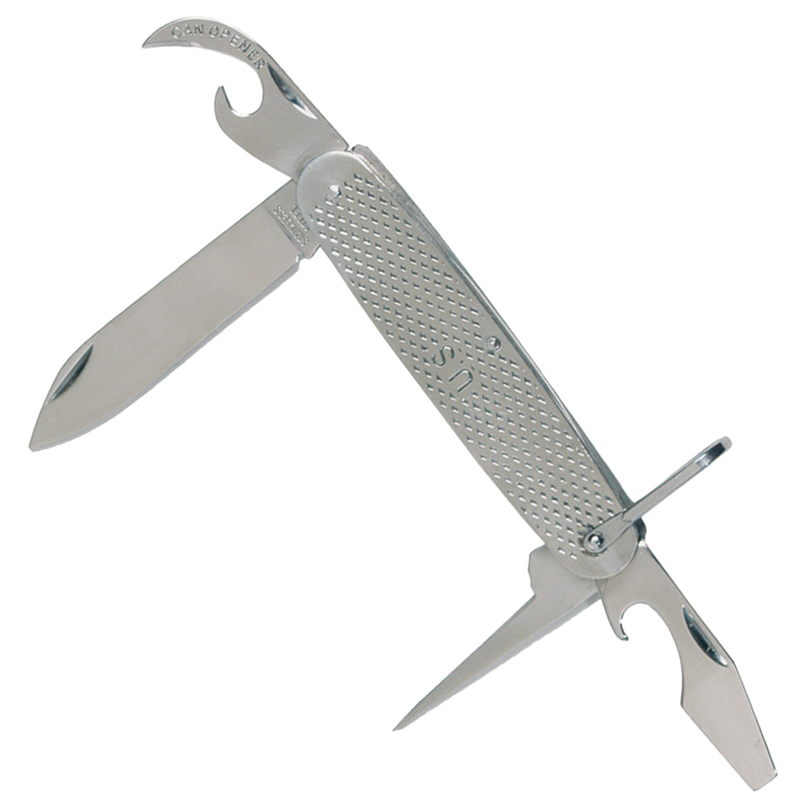 Our copy of the WWII style U.S. Army Pocket Knife is a great multi-purpose tool made in 100% stainless steel. In addition to the 2.8” spear point blade, it has both bottle and tin-openers, reamer, screwdriver, and a ring for attaching to a safety belt. Overall length is 8.4”.