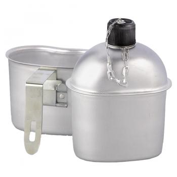 Our US one-quart aluminum Canteen and Cup with steel handle is an excellent quality reproduction of the iconic GI canteen and is complete with the original type Bakelite Cap & chain. It fits our M-1910 Canteen Cover, sold separately.