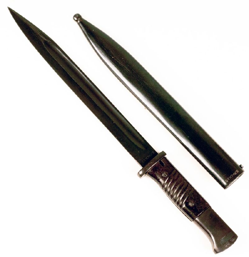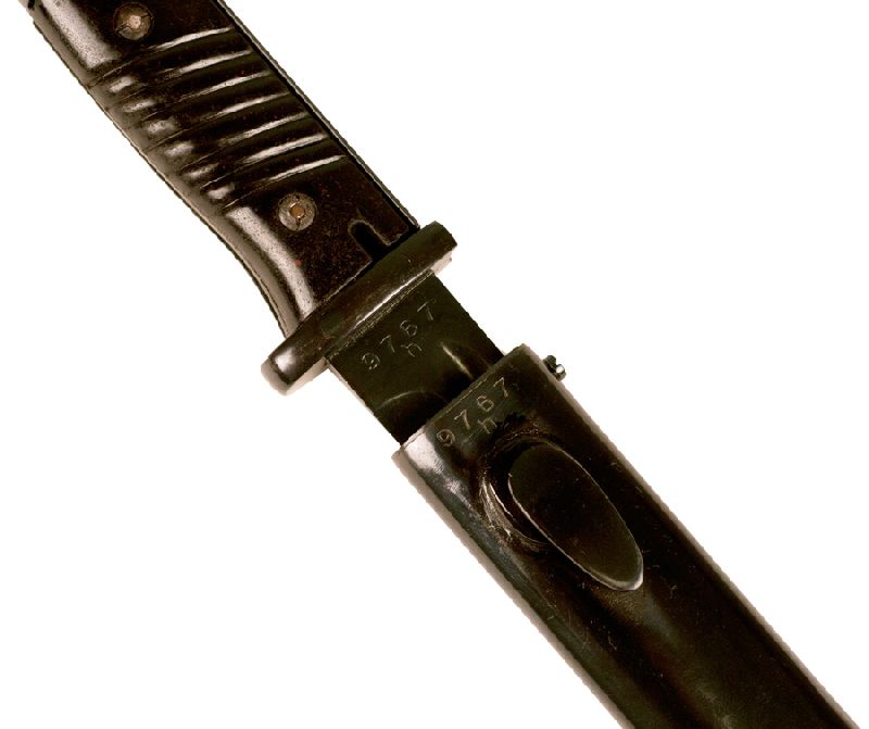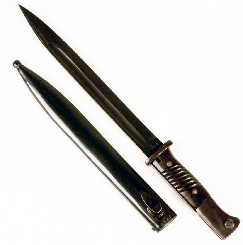 Complete with a fully functional spring catch release button for attachment to your rifle, this was the standard issue bayonet for the famous German Mauser rifle during WW II, with its 9.75” blade and an overall length of 16”.