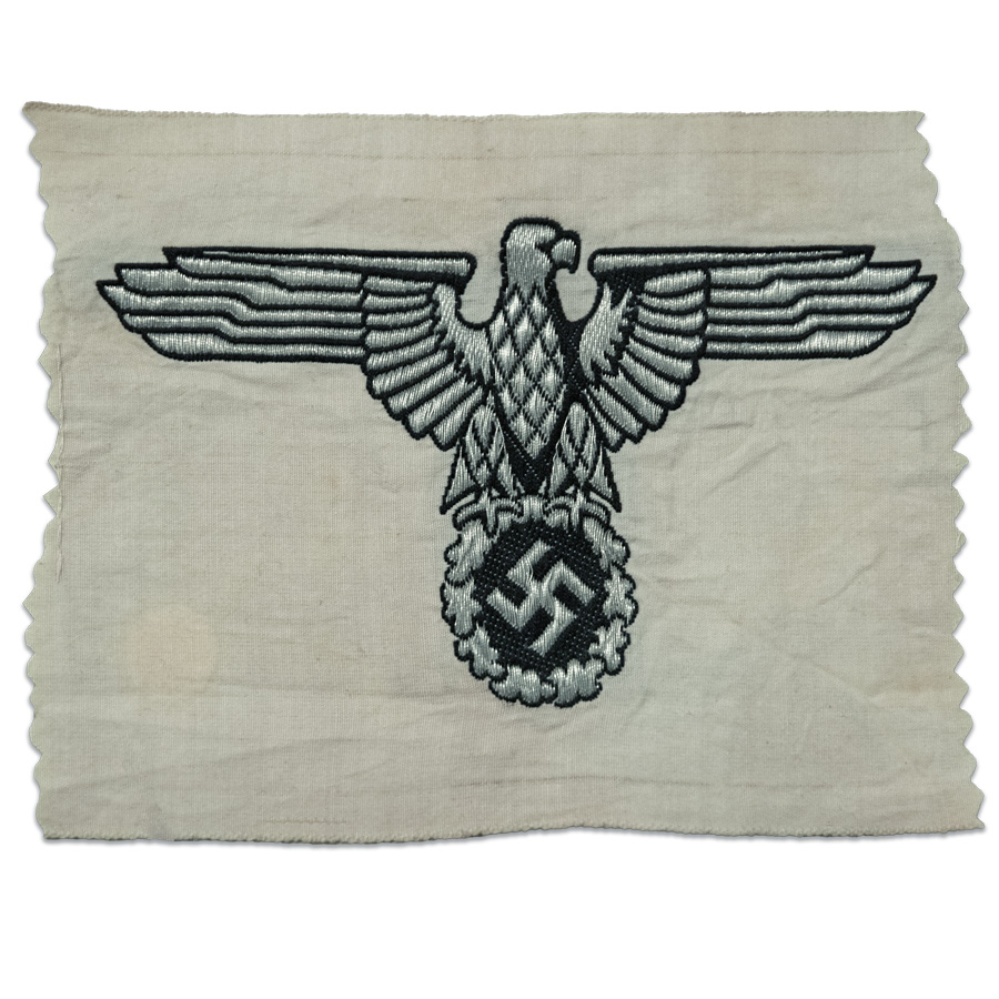 These Bevo woven, silver Police "Ordnungspolizie" Eagles are old stock, and quite possibly left over from World War 2. They are woven with silver wire and black cotton thread on an off-white, rayon background and are rather rare. We only have a very limited quantity available!