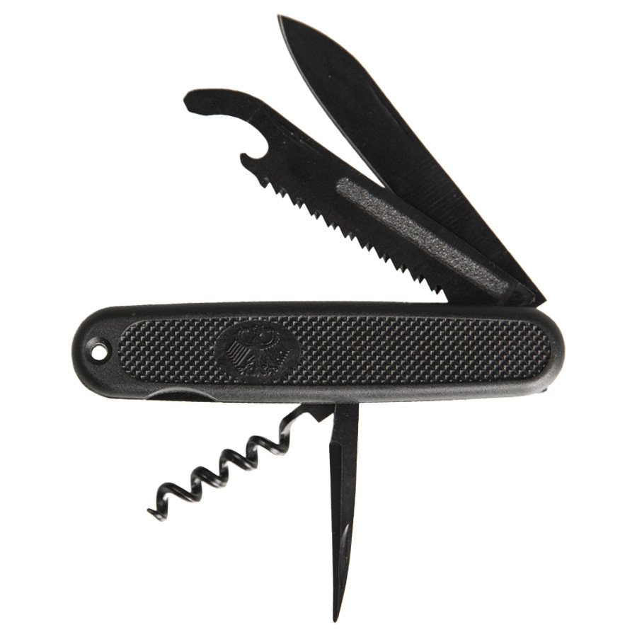 This Old Style Black Pocket Knife is the version of the Bundeswehr Pocket Knife that was issued as an all-purpose tool! It features 3CR13 steel blade 3.14” long, corkscrew, reamer & punch, wood saw, file bottle opener and small screwdriver, all housed in the 2CR13 steel hilt with ABS polyurethane plastic cover engraved with the ‘Bundesadler’. Closed length 4.33”. A real bargain at this price!